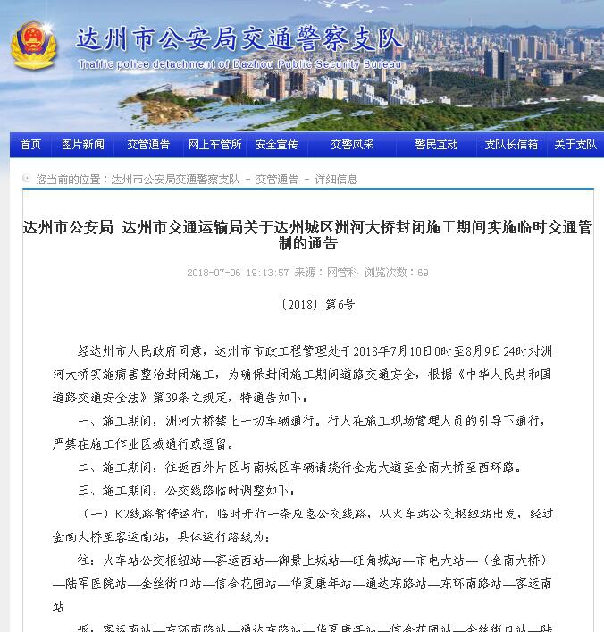 經(jīng)達(dá)州市人民政府同意,達(dá)州市市政工程管理處于2018年7月10日0時(shí)至8月9日24時(shí)對洲河大橋?qū)嵤┎『φ畏忾]施工,為確保封閉施工期間道路交通安全,根據(jù)《中華人民共和國道路交通安全法》第39條之規(guī)定,特通告如下: